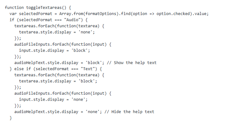 Using my skills in JavaScript, I developed and tested a new front-end interface for the form. The goal was to implement a simple choice that would direct users to the correct input method. Additionally, when selecting an audio format users would not see any text boxes, instead the attention would be focused to uploading specific audio files to each question. My approach was to ensure the solution was not only functional but also incredibly easy to navigate.